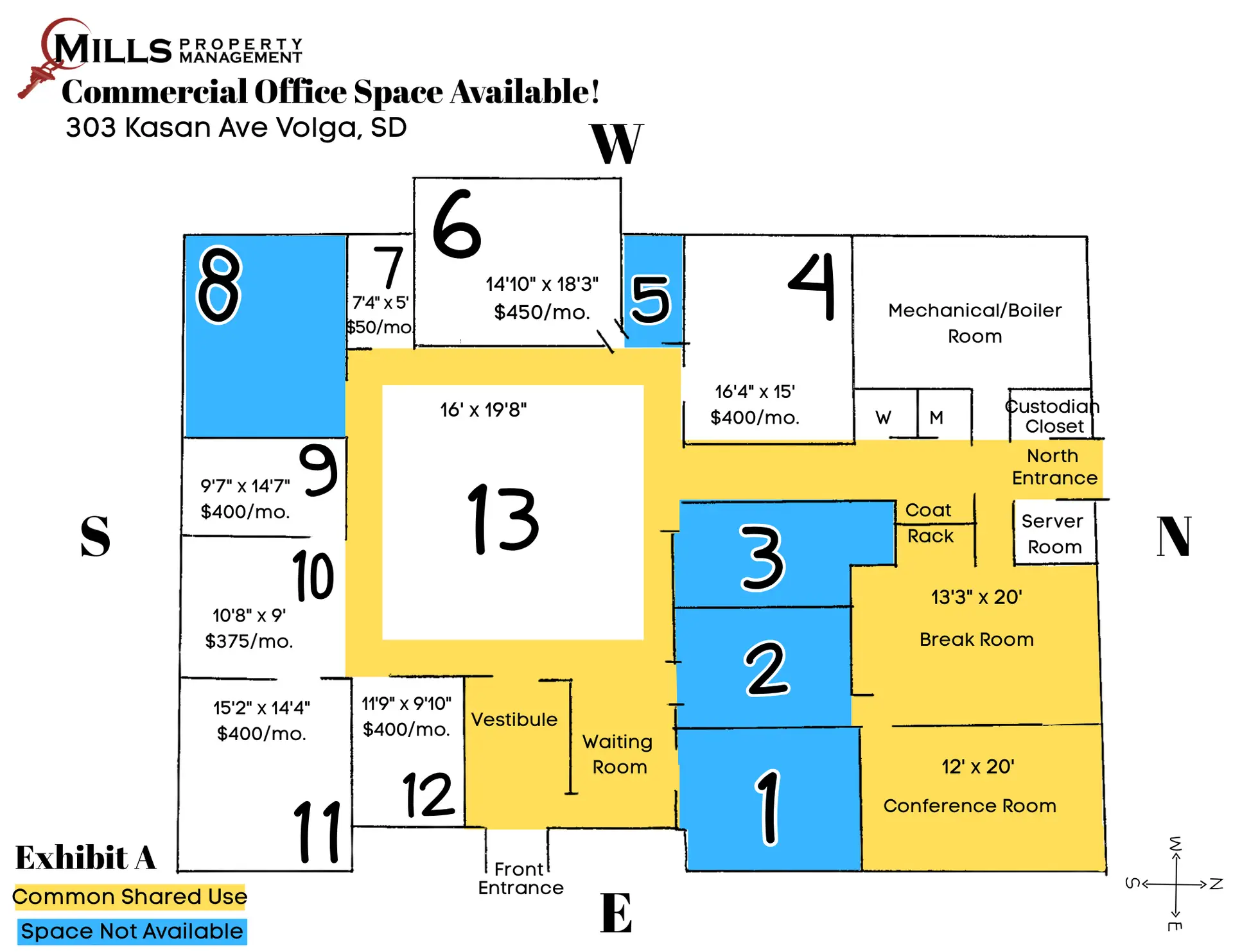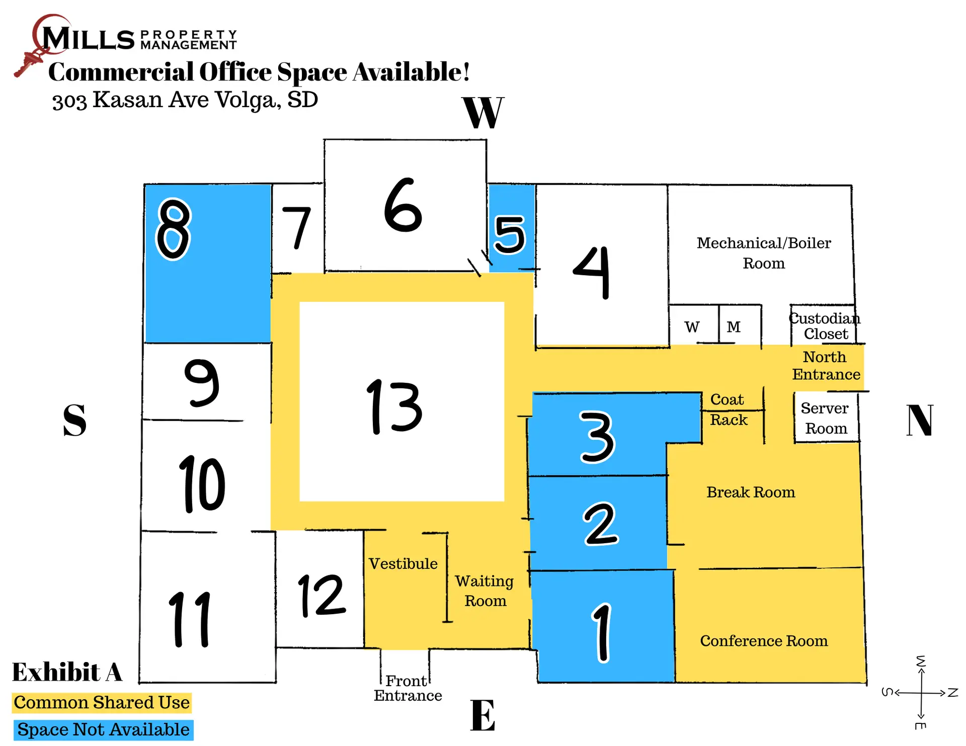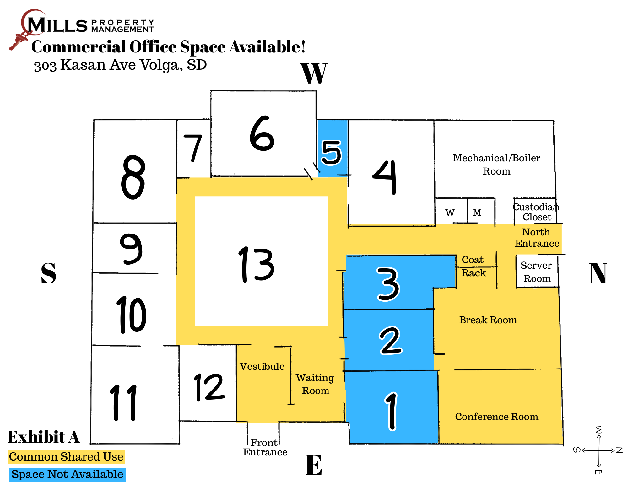 303 Kasan Ave in Volga, SD (former BankStar location), is a welcoming stand-alone corner building on Main Street (Kasan Avenue). This 4,500 sq. ft. building features 7+ offices, a conference room, and a breakroom. Office spaces may be leased individually, with office furniture included, if the tenant is interested in using it. If you’re looking for a nice private office, with common areas to share with co-tenants, this may be a perfect office leasing opportunity for you.